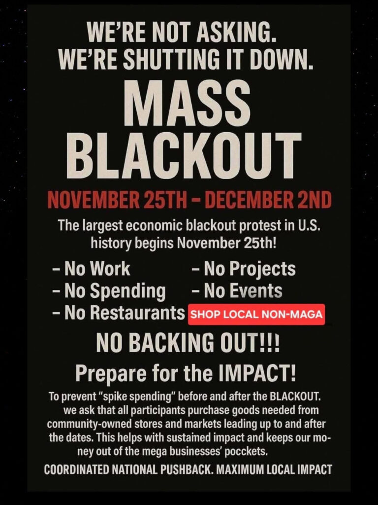 5. Stop or severely reduce purchasing during protest. DO NOT BUY from AMAZON, box stores, chain retailers, chain restaurants. DO NOT participate in Black Friday or Cyber Monday. The exception of ONLY non-MAGA small local businesses (local food trucks, local handmade craft markets, farmers markets, smalll local farms/wines/breweries, small/local grocery & coops, ma & pa businesses ONLY!) Shop small and local business before and after protest to prevent spending spikes in economy, or only shop small and local if absolute necessities are needed during protest.