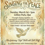 - Singing for Peace Sunday March 1st at 1 PM in Libbey ParkSacred Voices Ojai Presents Singing for Peace Sunday, March 1st 1pm Libbey… Read more: Singing for Peace Sunday March 1st at 1 PM in Libbey Park