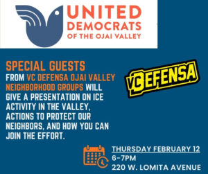 VC Defensa’s Ojai Valley Neighborhood Groups will be presenting at the monthly meeting of the United Democrats of the Ojai Valley. They will update us on ICE activity in the valley and give us information on how we can all show up and protect our neighbors.